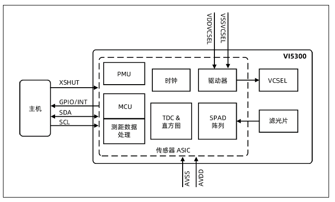 VI5300直接飞行时间(dToF)传感器采用单模块封装设计,集成了单光子雪崩二极管(SPAD)接收阵列以及VCSEL激光发射器。该传感器可对物体进行精确的距离测量而不受物体颜色、反射率和纹理的影响,为市场上的微型ToF传感提供了紧凑的解决方案。 利用自主研发的SPAD和独特的ToF采集与处理技术,VI5300可实现最大4米的精确距离测量,快速测距频率可达90Hz。